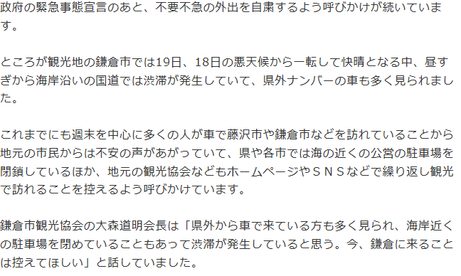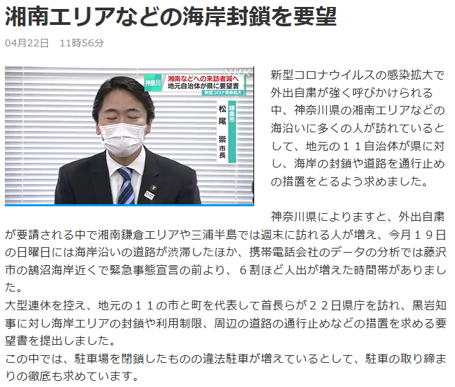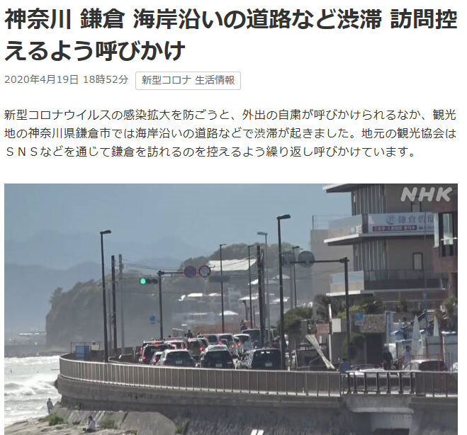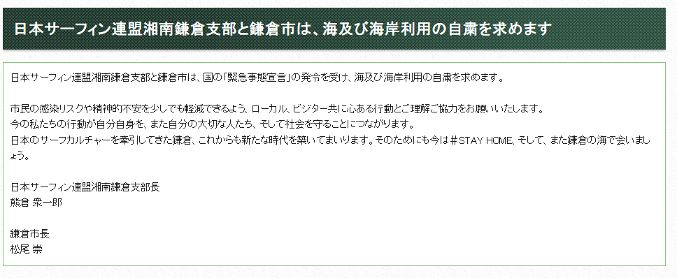 新型コロナウイルス感染拡大に伴う緊急事態宣言が全国に発令されていますが、鎌倉市に訪れる人の減少は見受けられません。観光客が多数訪れ海岸線も交通渋滞が続いています。海岸はサーフィンをする人で溢れています。人口17万人の鎌倉市で新型コロナウイルスの感染者数は、4月21日現在34人(鎌倉市ホームページより)で人口に対する割合は非常に多く横浜市の約3.2倍になります。オーバーシュート(感染爆発)を避けるために鎌倉市への観光を控えて下さい。日本サーフィン連盟湘南鎌倉支部と鎌倉市では海及び海岸利用の自粛を求めています。一人一人の自粛が新型コロナウイルスの収束に向かわせる事が出来、人の命を救えます。